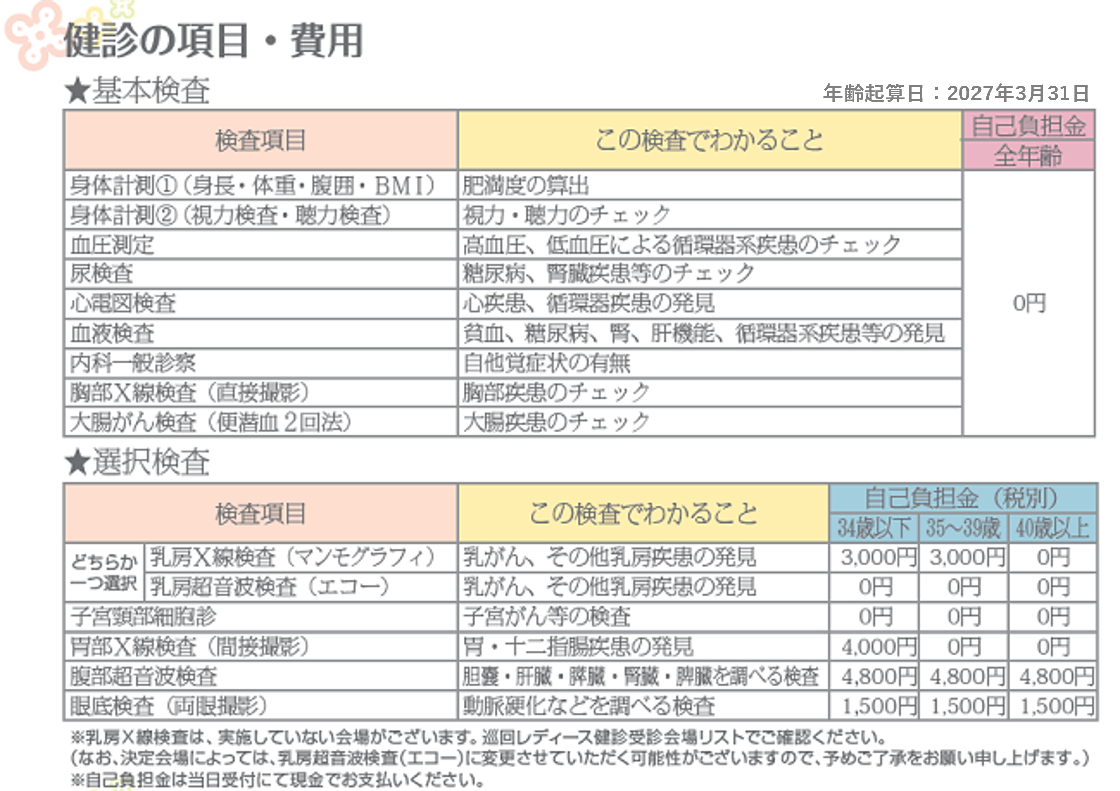 | 自己負担額 | 無料(追加オプションを除く) ※オプション検査を選択された場合の自己負担金は、当日受付にて現金でお支払いください。 |